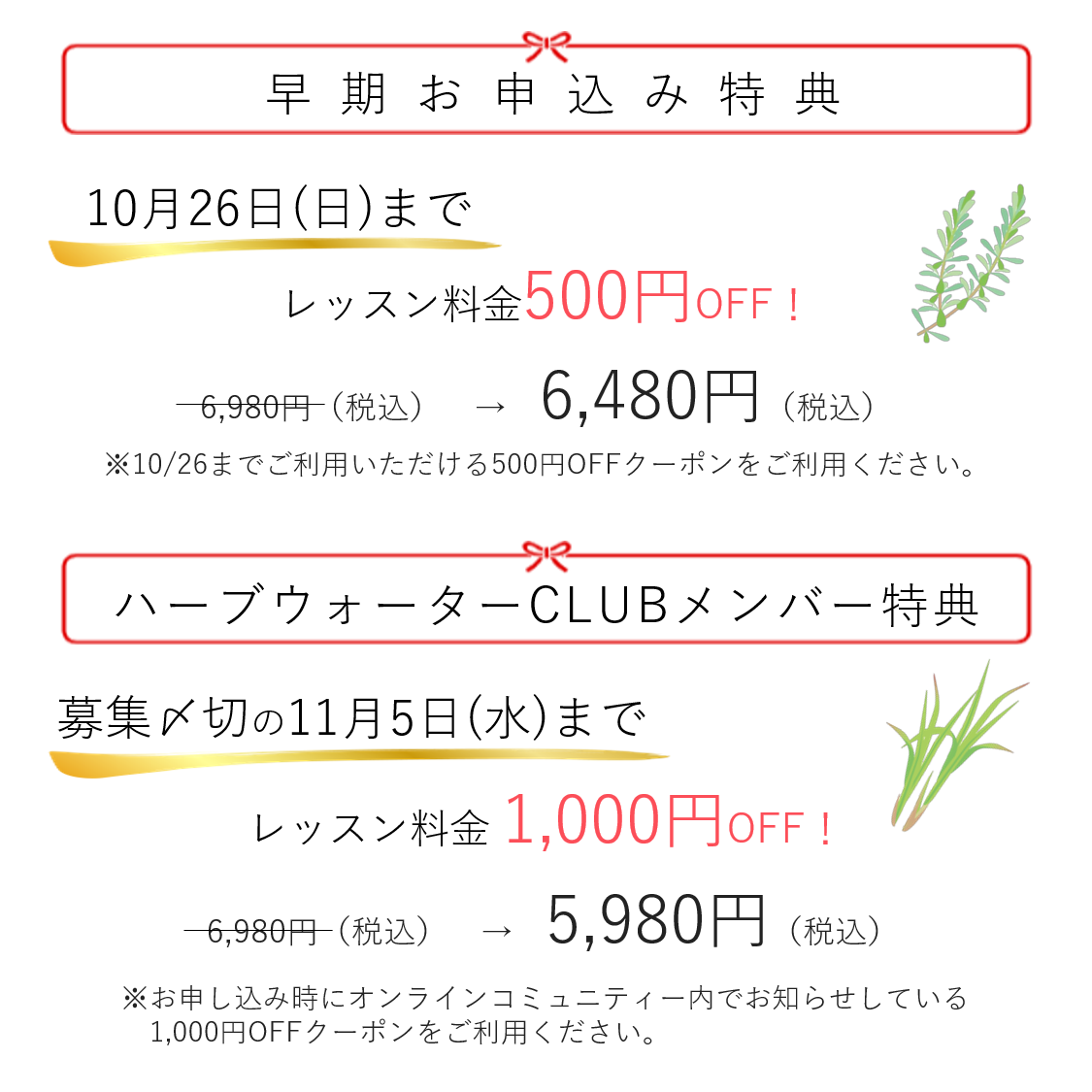 ハーブウォーターCLUBのメンバーは1,000円OFFで受講いただけます。