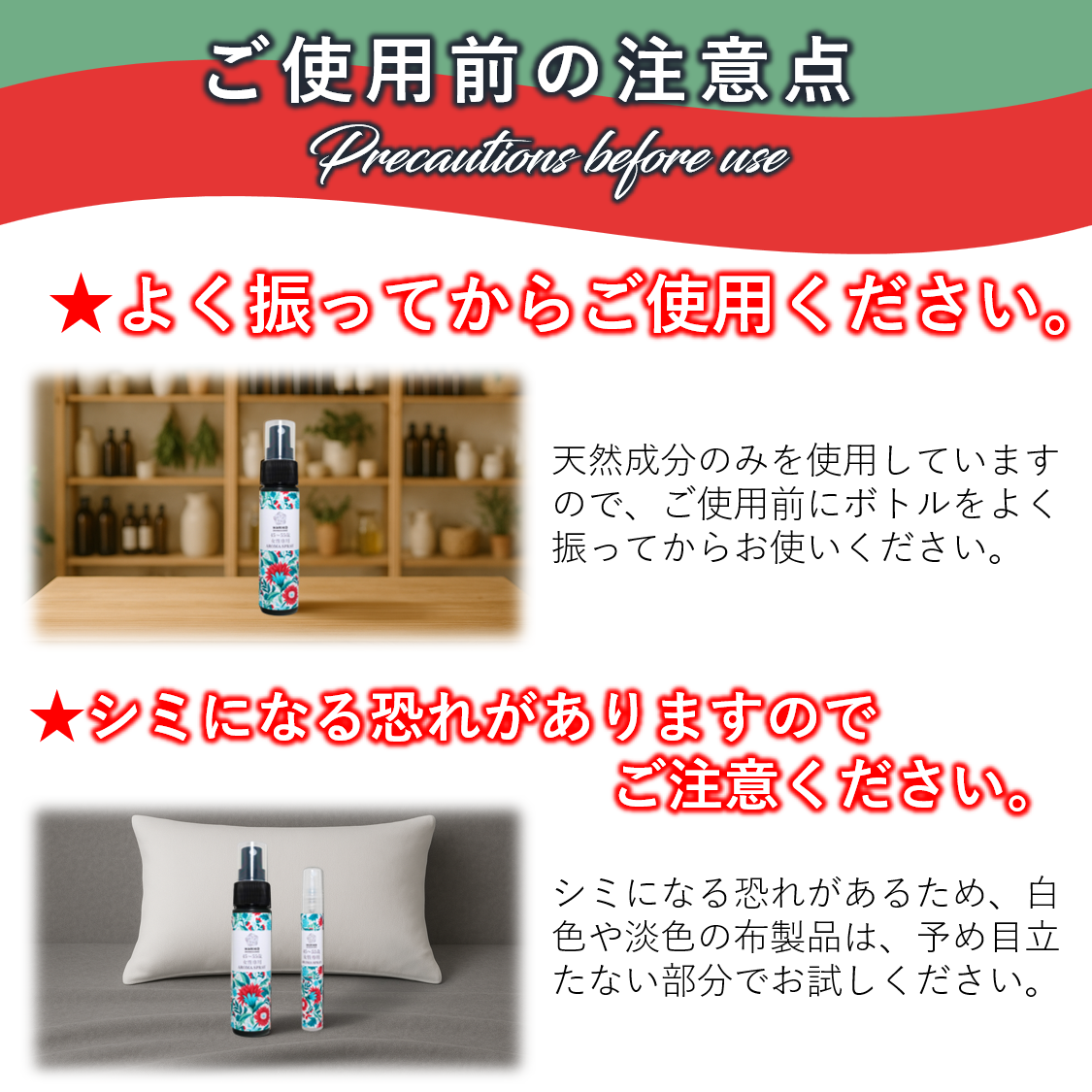 【使用方法】衣服や寝具、ハンカチやマスクなどに、よく振ってスプレーしてください。