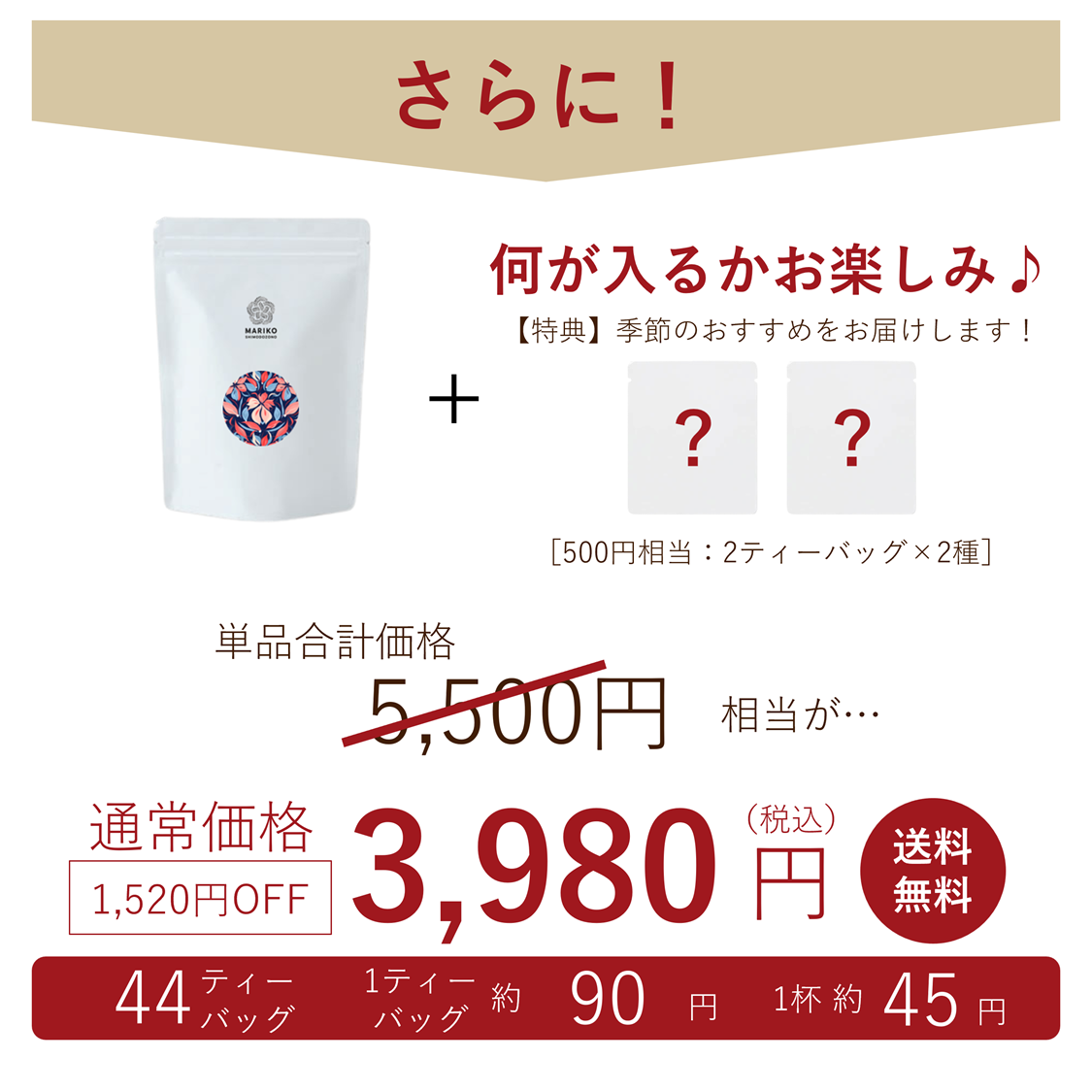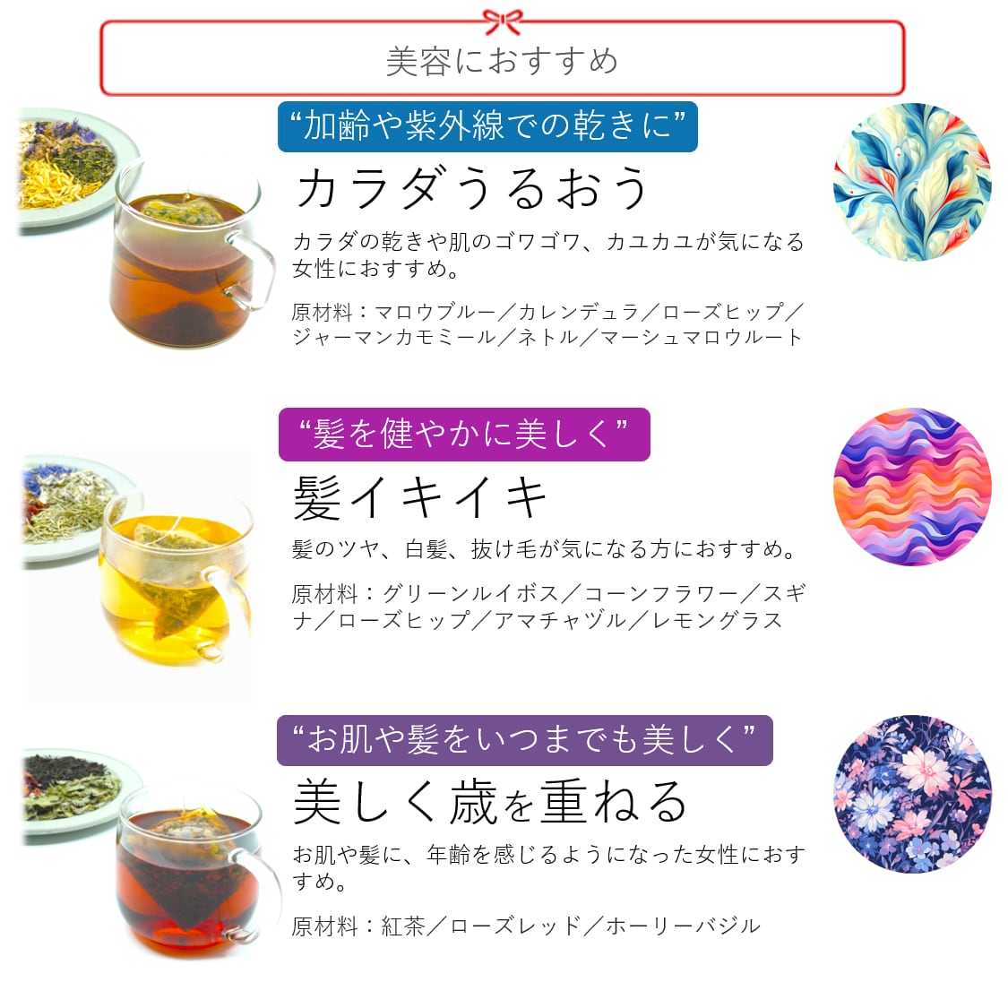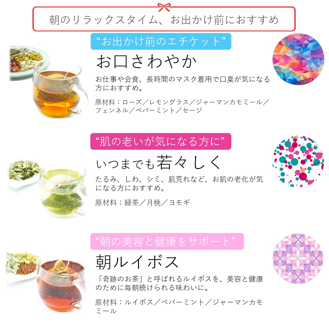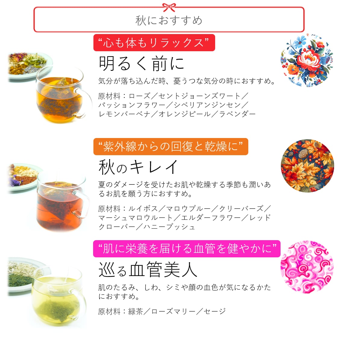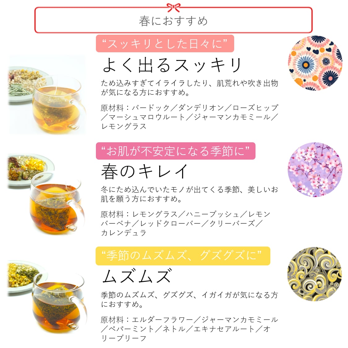 原材料:ルイボス/マロウブルー/クリーバーズ/マーシュマロウルート/エルダーフラワー/レッドクローバー/ハニーブッシュ