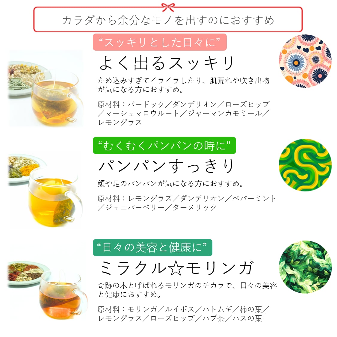 原材料:モリンガ/ルイボス/ハトムギ/柿の葉/レモングラス/ローズヒップ/ハブ茶/ハスの葉