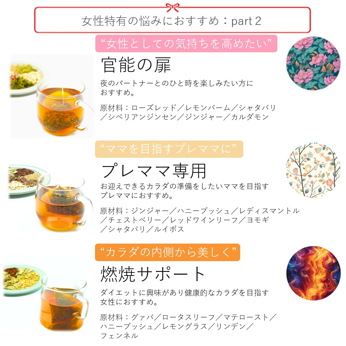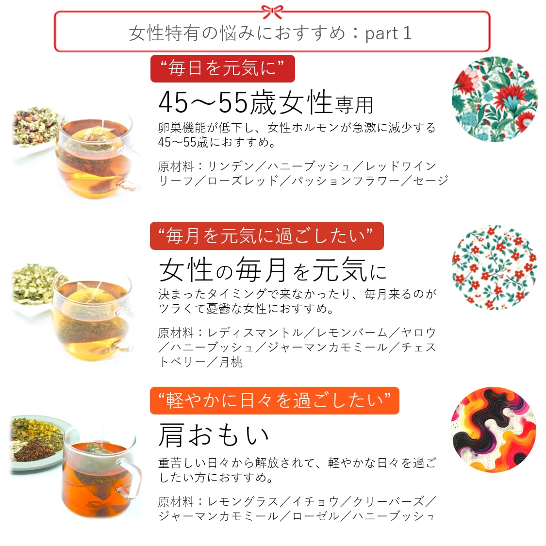 原材料:ジンジャー/ハニーブッシュ/レディスマントル/チェストベリー/レッドワインリーフ/ヨモギ/シャタバリ/ルイボス