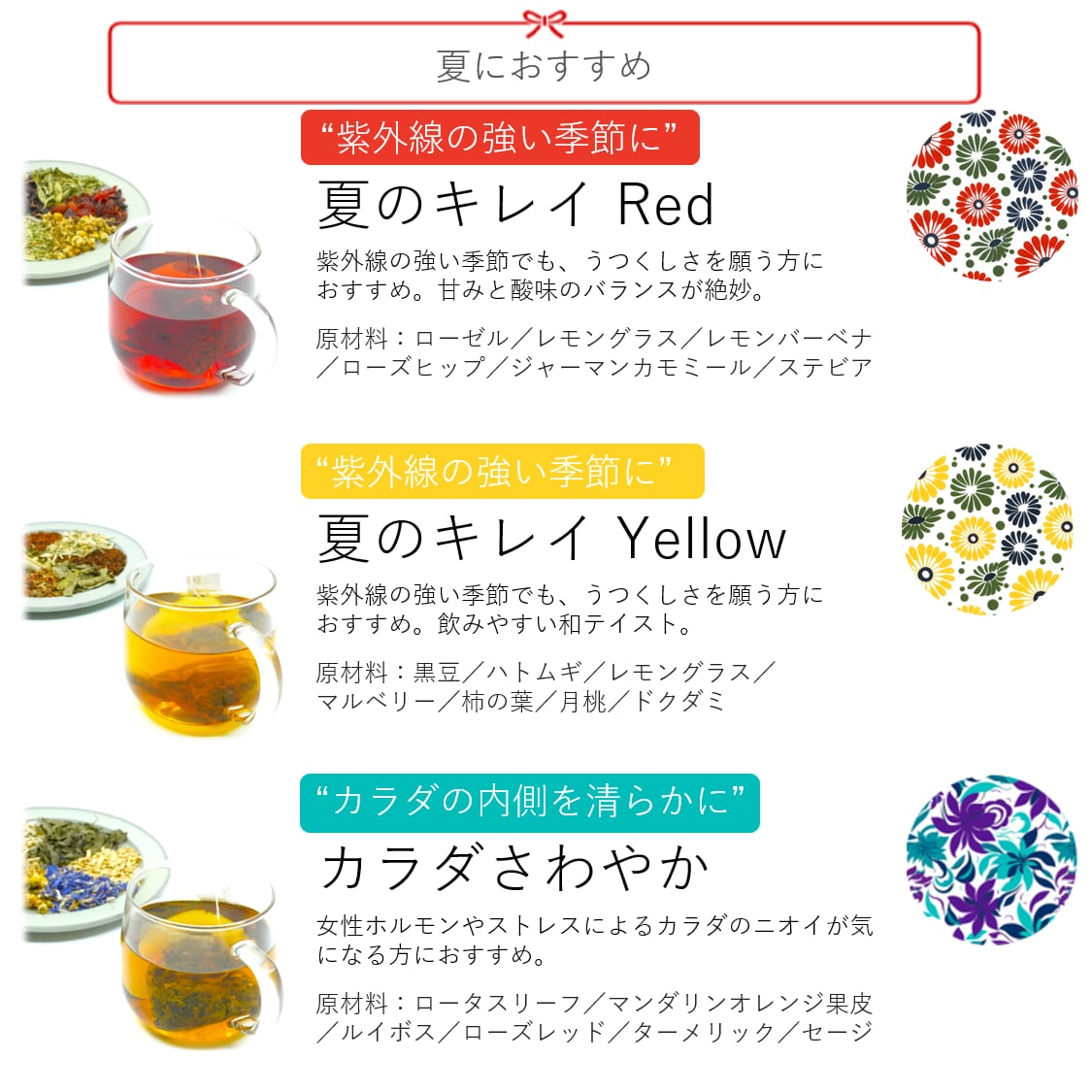 原材料:レモングラス/イチョウ/クリーバーズ/ジャーマンカモミール/ローゼル/ハニーブッシュ