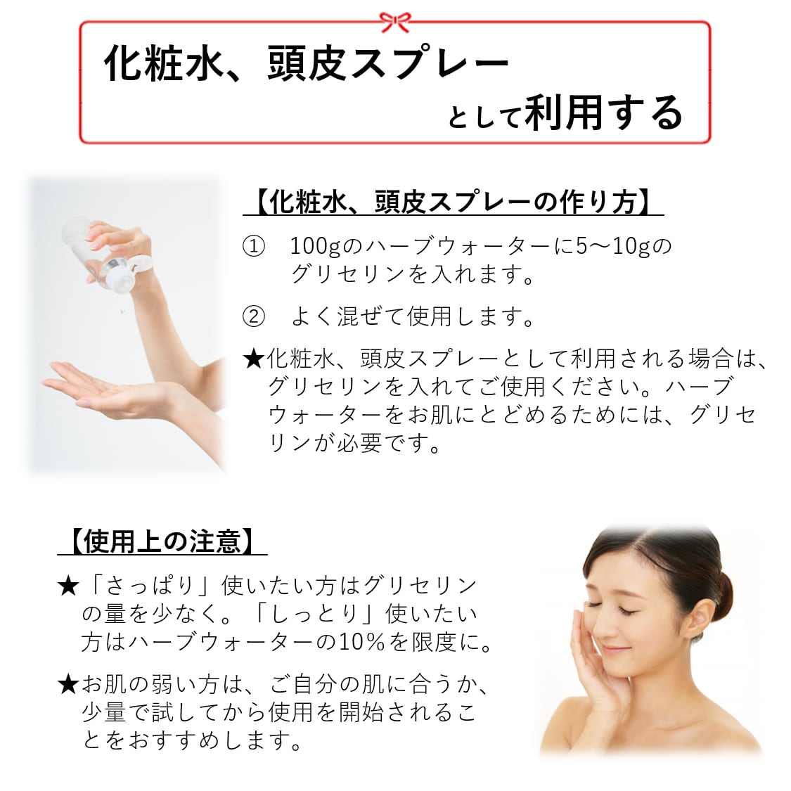 100mlのハーブウォーターに、10ml以下のグリセリンを入れて化粧水として使用します。