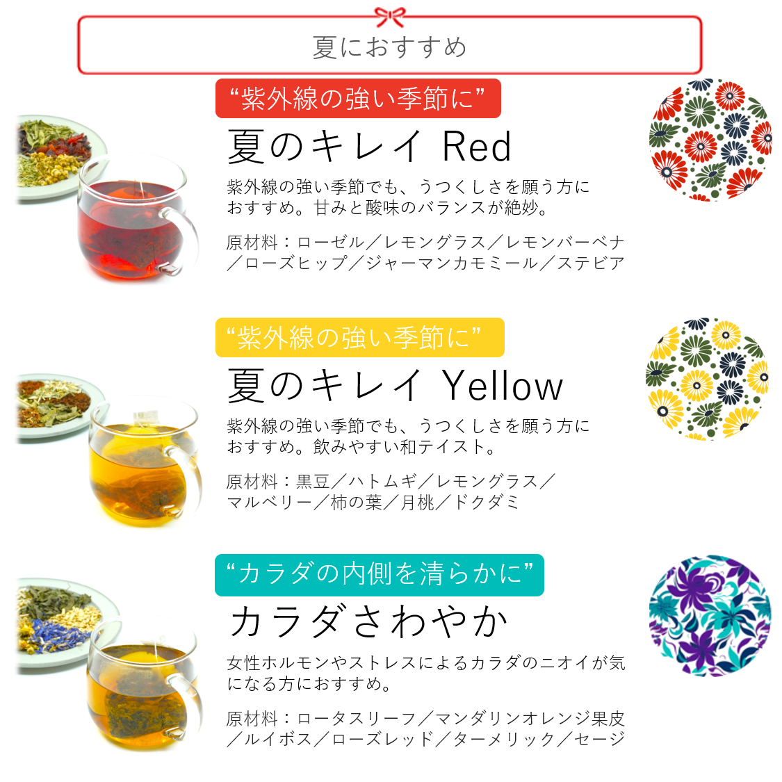 原材料:エルダー花/ルイボス/リンデン/レモングラス/ハニーブッシュ/カモマイルジャーマン/マルベリー/ローズマリー/レモンバーベナ/バタフライピー/マロー/ネトル/ローズヒップ/ローゼル/ハスの葉