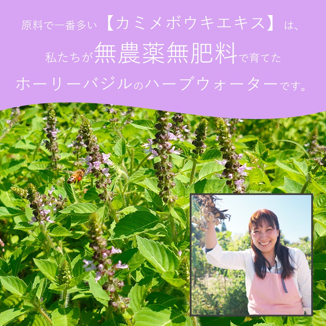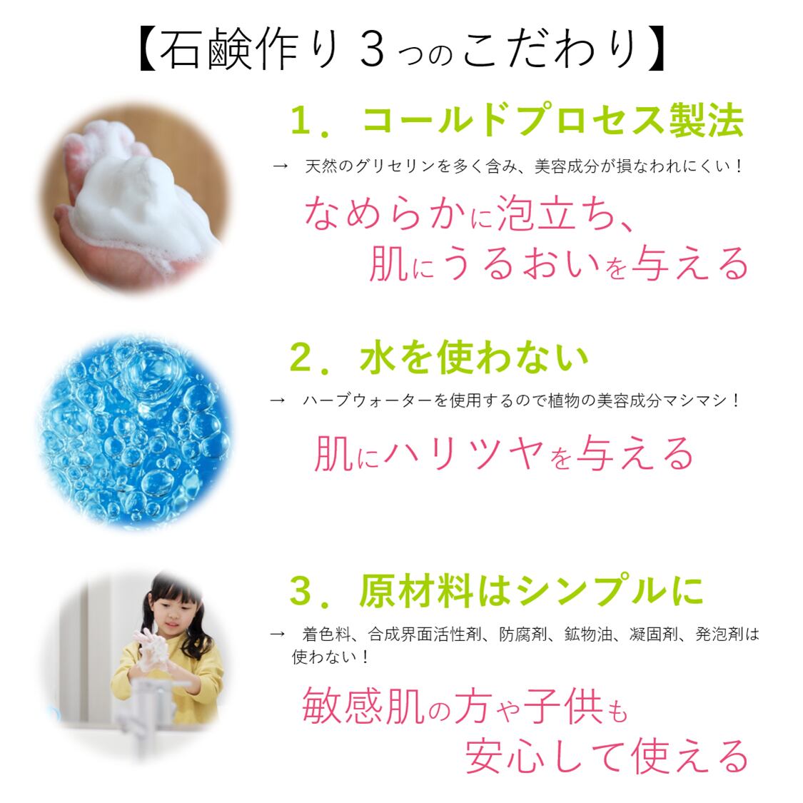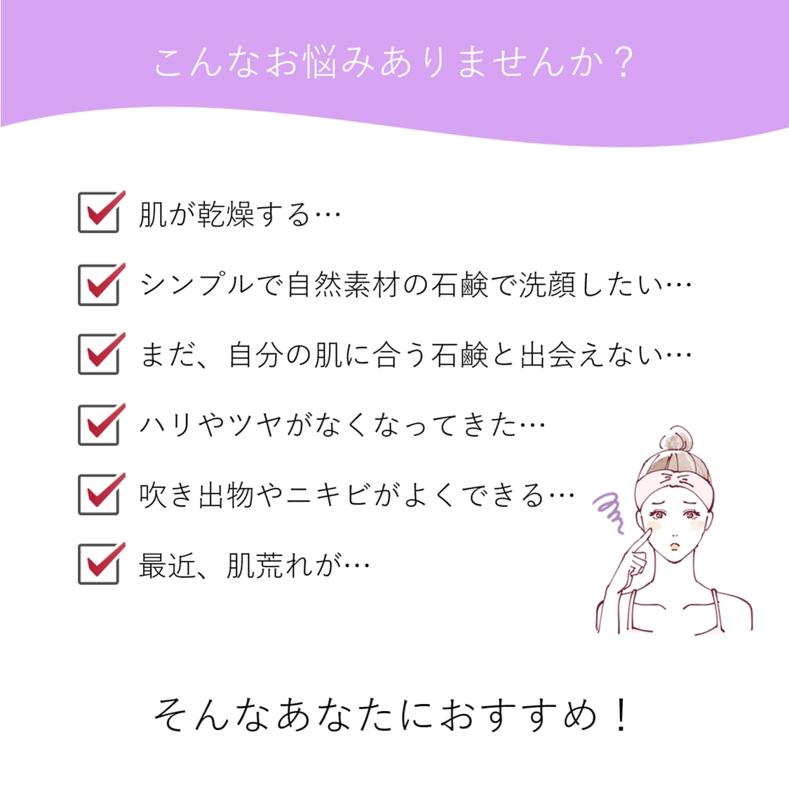 成分:カミミボウキエキス、マカデミア種子油、パーム油、ヤシ油、水酸化Na、コメヌカ油、クスノキ木油、ユーカリプッスラジアタ葉油、ラベンダー花油、ムラサキ根エキス