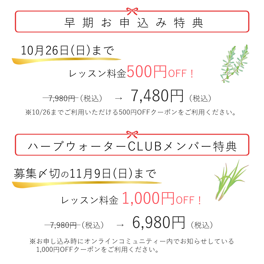 ハーブウォーターCLUBのメンバーは1,000円OFFで受講いただけます。