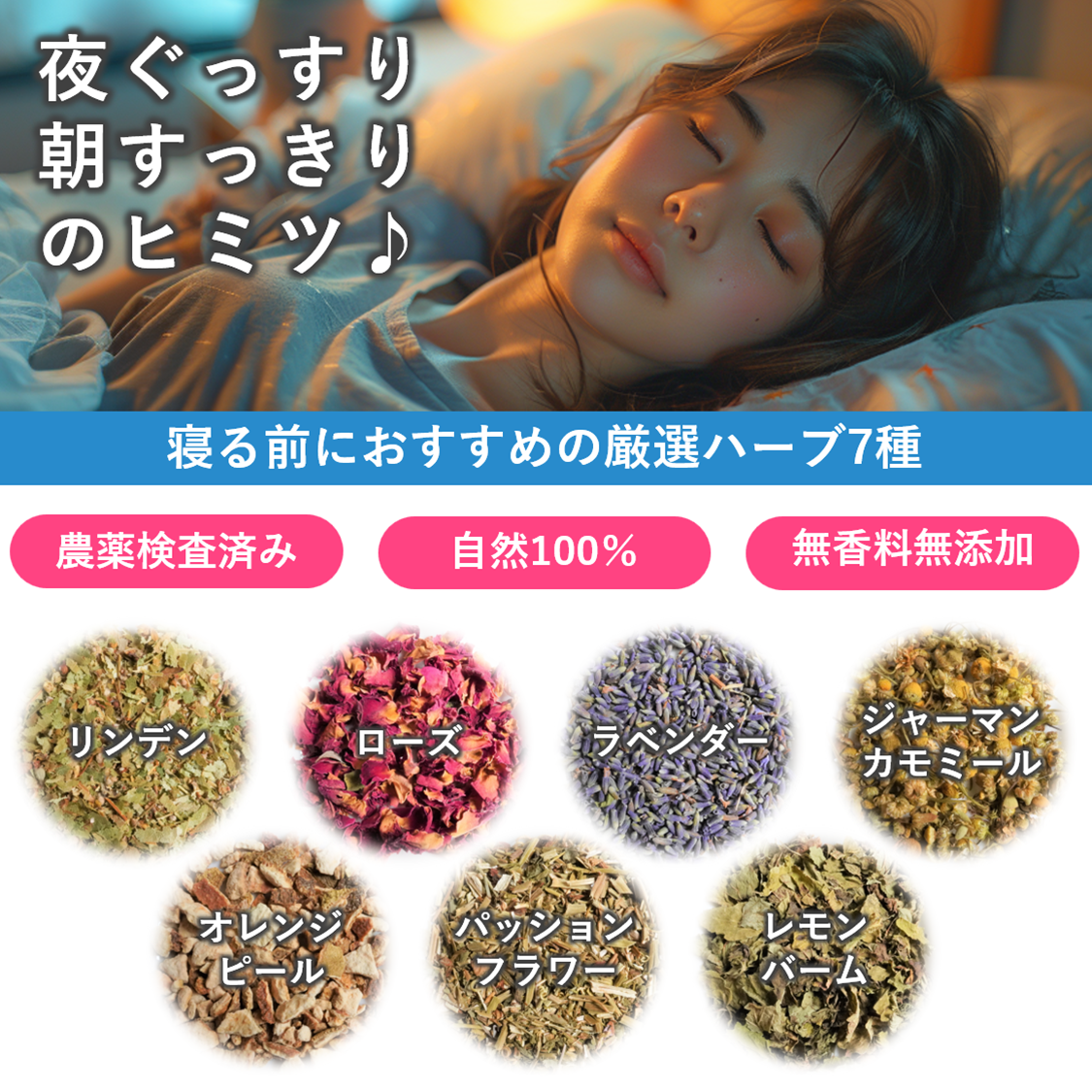 原材料:リンデン/ローズ/ジャーマンカモミール/オレンジピール/パッションフラワー/レモンバーム/ラベンダー