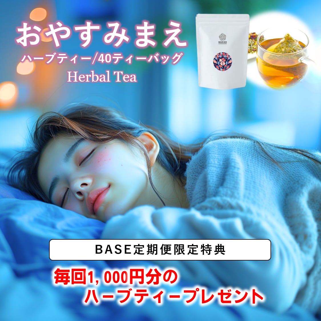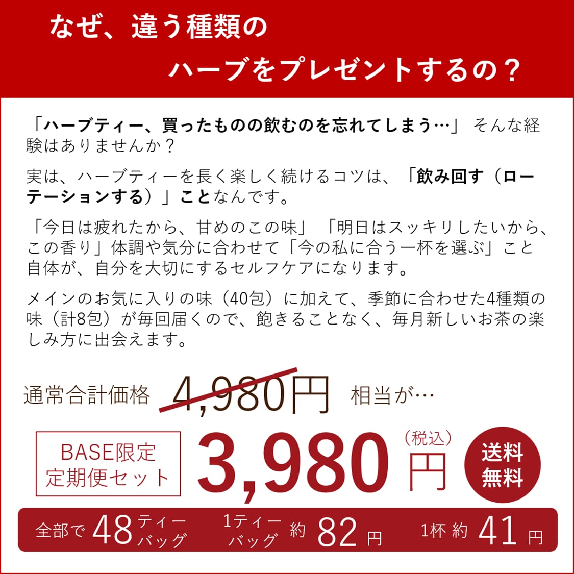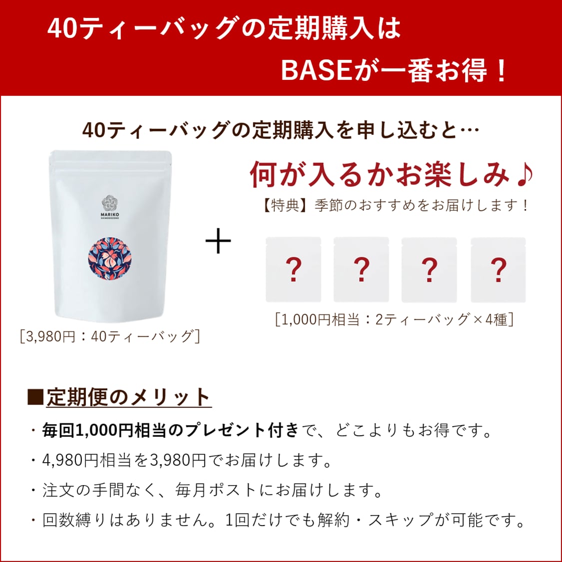 楽天・Amazonで大人気の40包入りハーブティーを、一番お得に、一番楽しみながら続けられるBASE限定の定期便コースです。